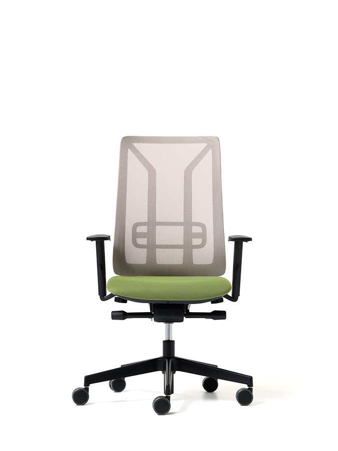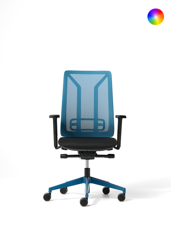 Sedia operativa con schienale dal design minimale realizzato in polipropilene nero o bianco proveniente da scarto industriale. Lo schienale rivestito in rete ignifuga di serie disponibile in 8 nuove colorazioni. Lo schienale è garantito di serie con il supporto lombare regolabile in altezza. Coprisedile in polipropilene nero o bianco proveniente da scarto industriale, interno sedile in legno certificato con garanzia di tracciamento forestale, imbottitura in poliuretano espanso. Meccanismo Syncron con traslatore. La meccanica permette l’oscillazione del sedile e schienale, lo schienale è regolabile in più posizioni, dotato di antishock. L’oscillazione schienale è regolabile d’intensità in base al peso dell’utilizzatore. Base a 5 razze in nylon nero o bianco o alluminio su ruote gommate. Braccioli 2D (altezza, larghezza) in nylon nero o bianco con pad nero soft touch o braccioli 4D (altezza, larghezza, rotazione e profondità pad) in nylon nero o bianco con pad nero soft touch. Optional: poggiatesta bianco o nero imbottito e rivestito, ruote forate.