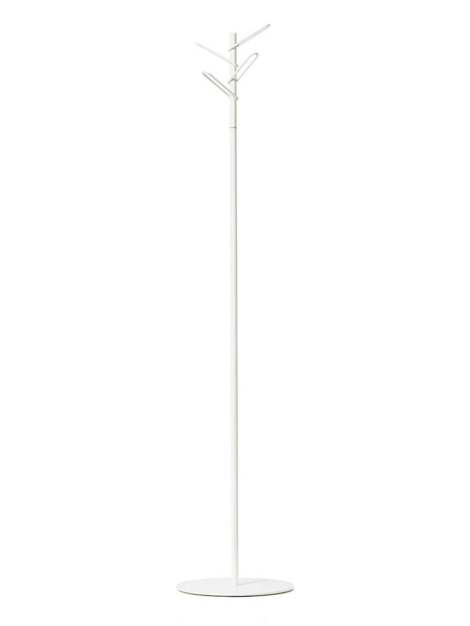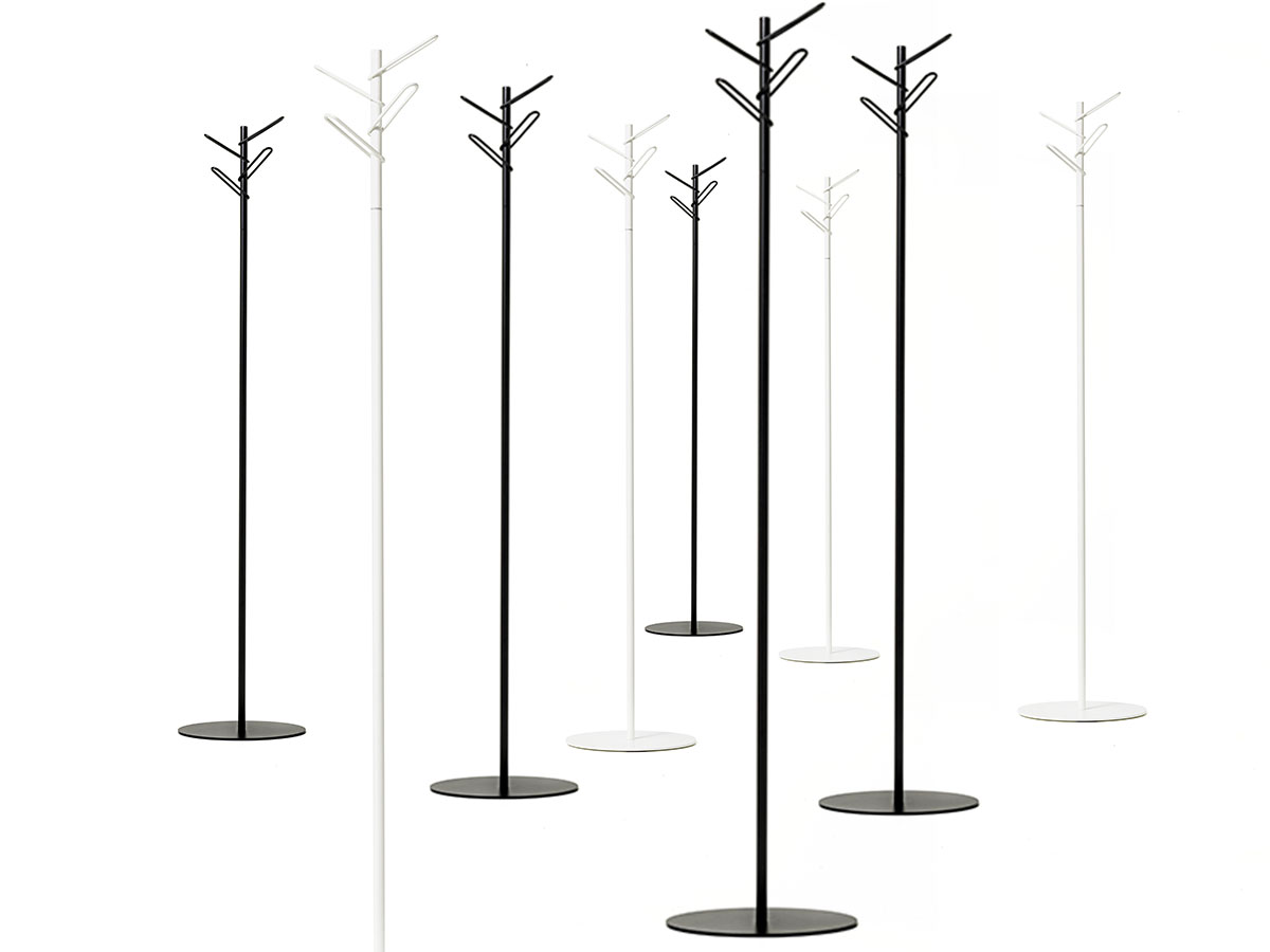 Kleiderständer mit einer Struktur aus Stahlrohr Ø 20 mm, Wandstärke 2 mm, mit 4 elliptisch geformten Haken aus Rundstahl Ø 6 mm. Sockel aus 6 mm starkem Blech, kreisförmig geformt mit Ø 350 mm. Erhältlich in schwarzer oder weißer Epoxidharz-Beschichtung mit glatter, matter Oberfläche. Gesamthöhe: 1650 mm.