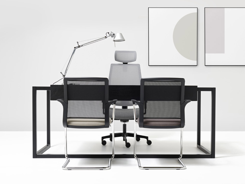 Les lignes modernes et légères caractérisent le design minimaliste du siège HOST, ici, combinées à la technologie de la résille, laisse place à une silhouette séduisante, à composantes ergonomiques très performantes. Idéal pour les environnements dynamiques et modernes, pour les salles de réunion et de conférence.