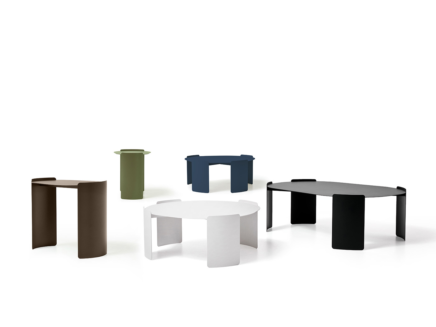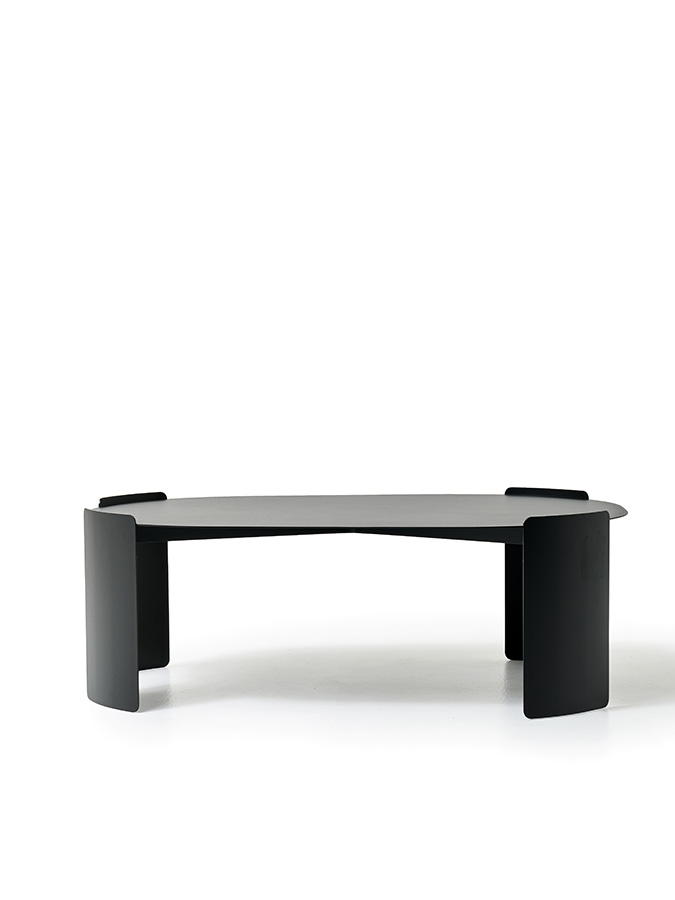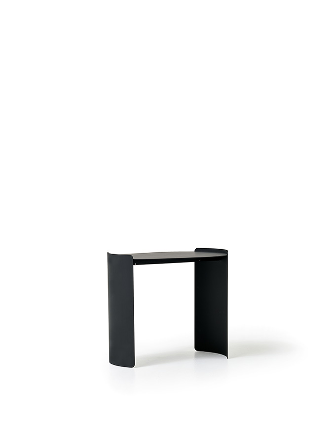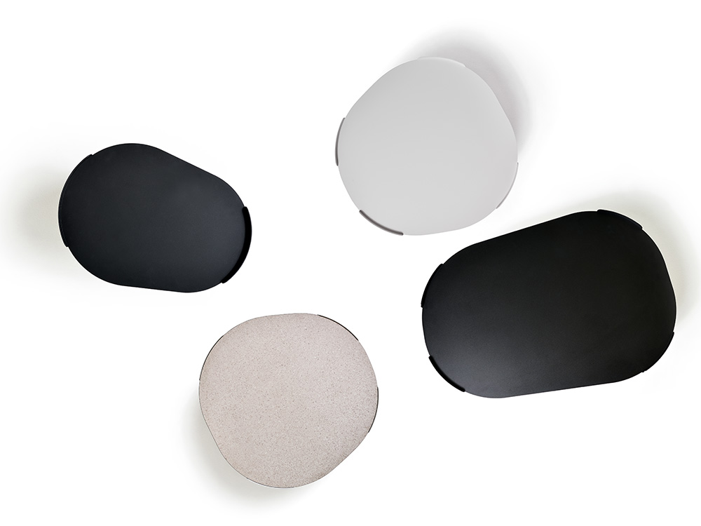 Les tables Plié ont une structure entièrement en métal, revêtue d’une finition époxy texturée, disponible dans les couleurs noir mat, blanc glace, marron, vert et bleu. La collection comprend trois dimensions: H 44 cm – plateau 50×37 cm, H 30 cm – plateau 70×70 cm, H 35 cm – plateau 100×70 cm. Le plateau irrégulier et asymétrique peut être complété par un dessus additionnel en HPL, d’une épaisseur de 6 mm, avec âme noire et finition supérieure effet pierre. Le dessus HPL repose sur la structure métallique.